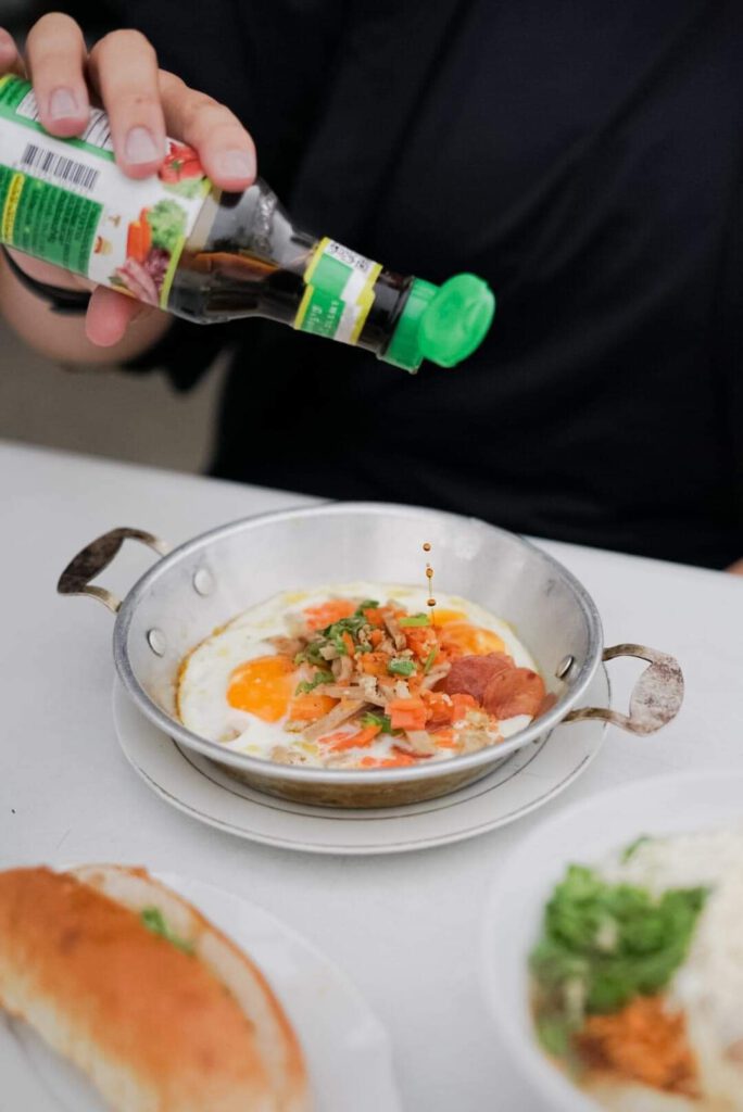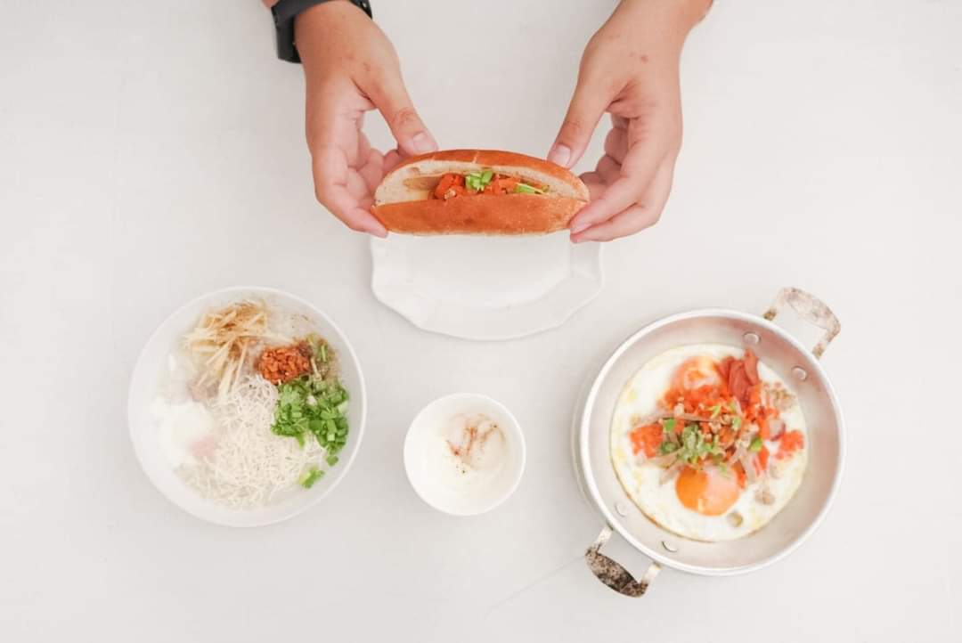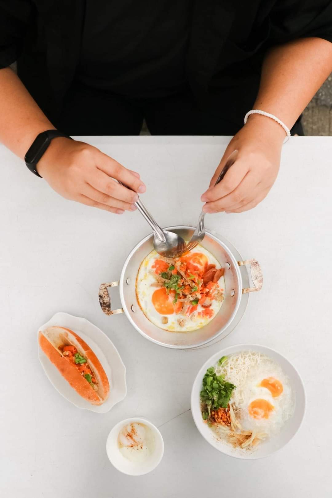 อาหารเช้ายอดนิยม ทอดไข่ดาวลงในกระทะแบนเล็ก ๆ มีหูสองข้าง แล้วก็โรยหน้าด้วยหมูยอ กุนเชียง หมูผัด เสิร์ฟแบบร้อน ๆ เหยาะพริกไทยและซอสปรุงรสลงไปตามใจชอบ